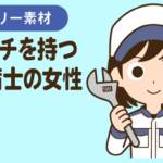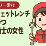 赤色の帽子とツナギを着て、レンチを持った整備士の女性です。