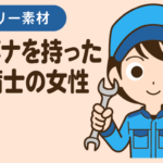 白色の帽子とツナギを着て、スパナを持った整備士の女性のイラストです。