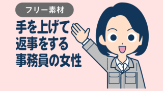 笑顔で手を上げる事務員の女性【無料イラスト】