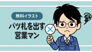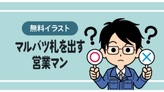 マルバツ札を持つ営業マン(上半身と全身イラスト)マルバツ札を持つ営業マンのイラストです。問題です!!