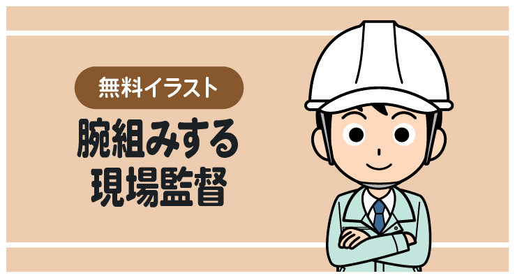 腕組みする現場監督(上半身と全身イラスト)ヘルメットをかぶった現場監督が腕を組んでいるイラストです。