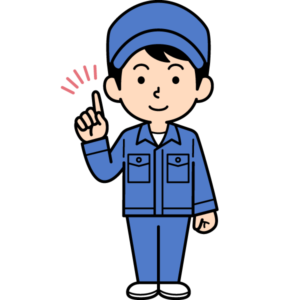 指差しするシンプルな作業員のイラストです。ワンポイント!