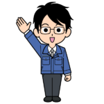 指差しするシンプルな作業員のイラストです。ワンポイント!