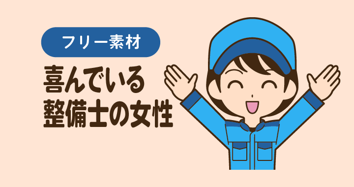 青色の帽子とツナギを着て、喜んでいる整備士の女性です。