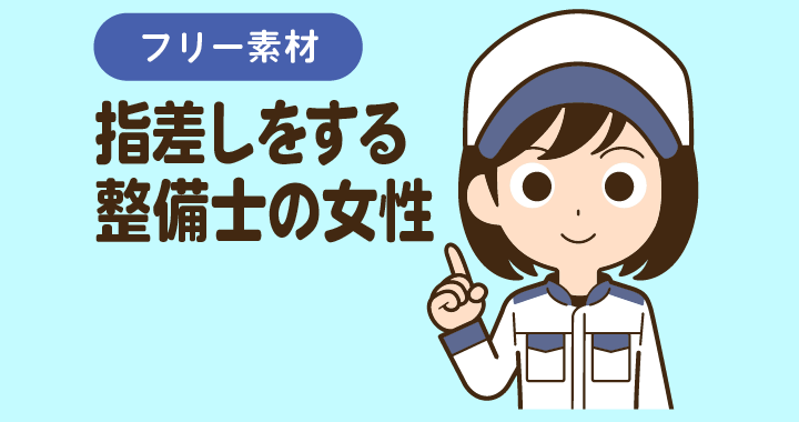 白色の帽子とツナギを着て、指差しする整備士の女性のイラストです。