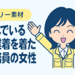 指差しする作業着すがたの事務員の女性(全身&スカート)
