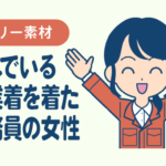 ガッツポーズする作業着すがたの事務員の女性C(上半身)