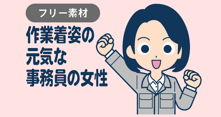 グレーの作業着を着て、ガッツポーズする事務員の女性です。