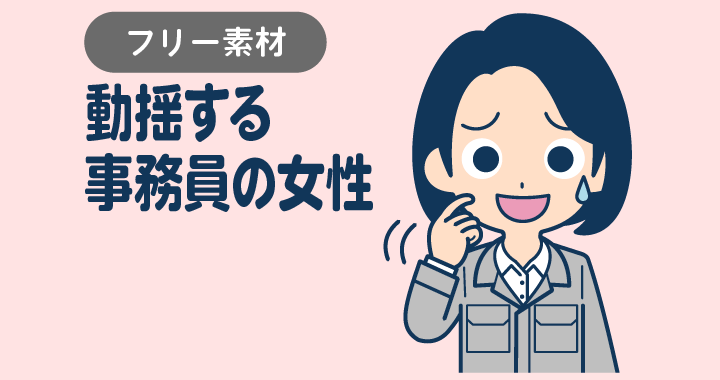 動揺して冷や汗をかく事務員の女性D(全身&作業ズボン)