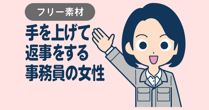 手を上げて返事をする事務員の女性D(全身&スカート)