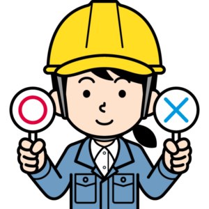 マル札とバツ札を出すシンプルな現場監督の女性のイラストです。○✖️クイズ始まるよぉ〜!