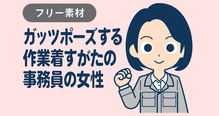 ガッツポーズする作業着すがたの事務員の女性【無料イラスト】