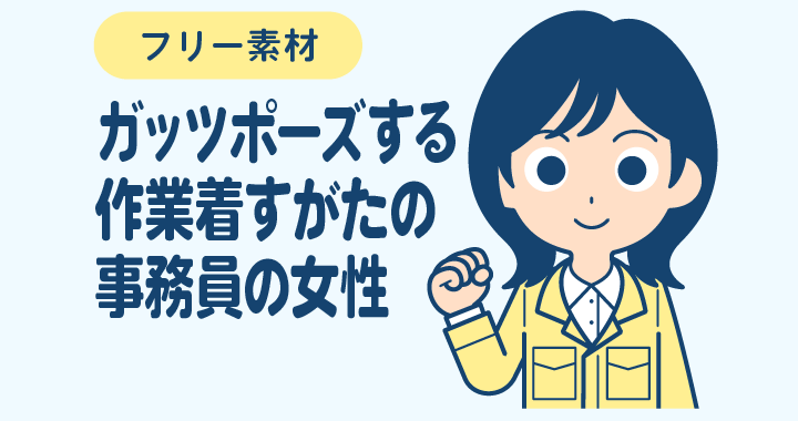 ガッツポーズする作業着すがたの事務員の女性【無料イラスト】