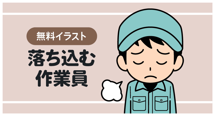 落ち込む作業員(上半身と全身イラスト)帽子をかぶった作業員が落ち込んでいるイラストです。